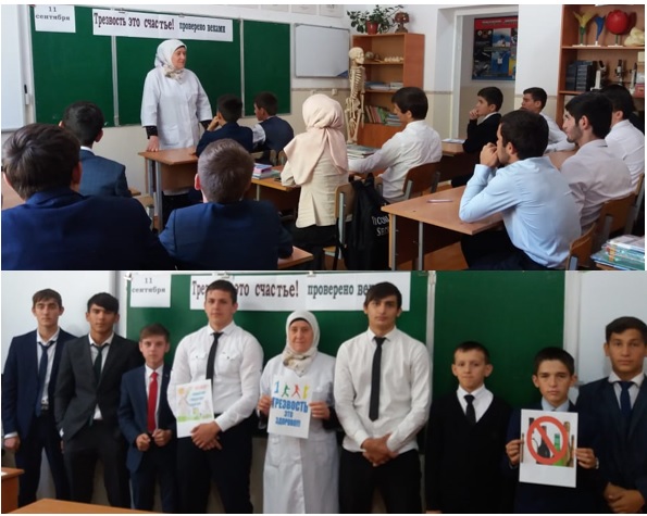 В старших классах проведена беседа зав.ФАПом Абдулмежидовой Т.В.. В ходе беседы Товман Висадиевна дала понятие трезвости, как непреложной ценности человека, семьи, общества, основы различия добра и зла, ответственного отношения к себе в окружающем мире, семье, школе. (охват 24)