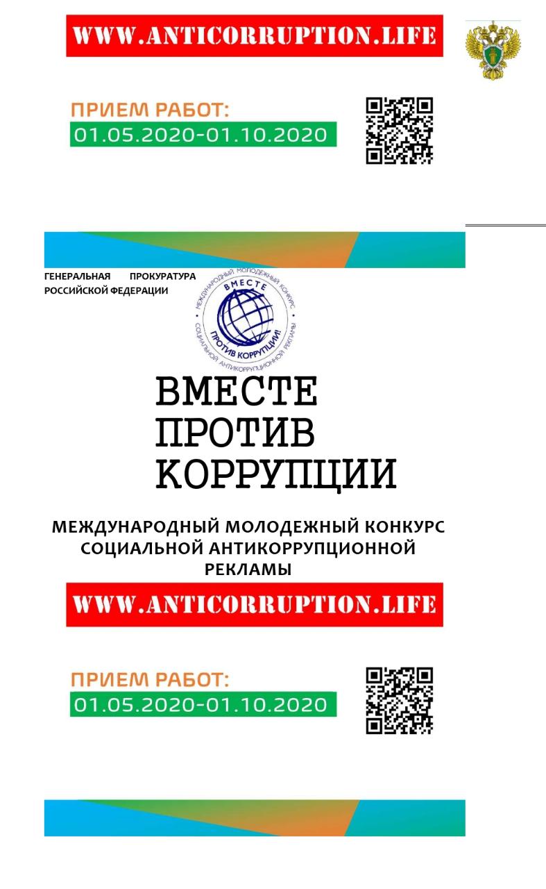 Генеральной прокуратурой Российской Федерации в текущем году организован Международный молодежный конкурс социальной антикоррупционной рекламы на тему «Вместе против коррупции!»Проведение конкурса анонсировано на 8-й сессии Конференции государств- Участников Конвенции Организации Объединенных Наций против коррупции.Прием работ будет осуществляться с 01. Мая по 01. Октября 2020 г. на официальном сайте конкурса http://anticorruotion.life по двум номинациям – социальный плакат и социальный видеоролик.