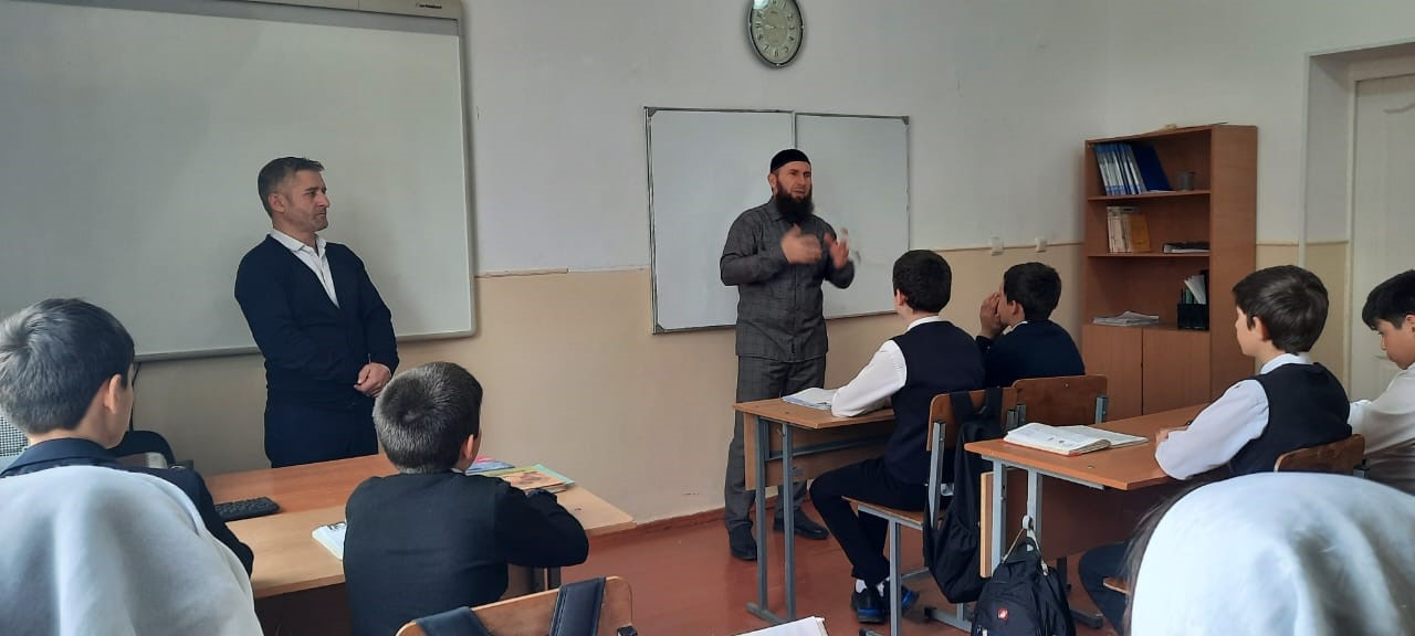 Педагог ДНВ Абдулшаидов Х.М. провел беседу с обучающимися 7 класса о ценностях мусульманина.(охват-19)
