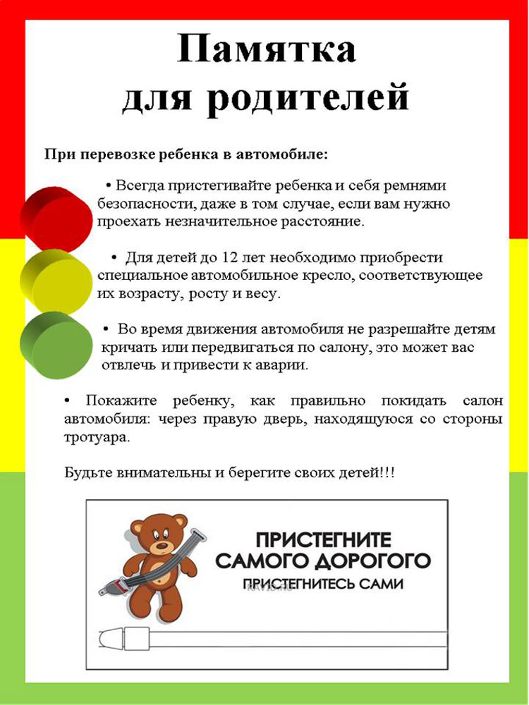 28.05.2024Памятка для родителей по обучению детей правилам дорожного движения Не спешите, переходите дорогу размеренным шагом. Выходя на проезжую часть дороги, прекратите разговаривать - ребенок должен привыкнуть, что при переходе дороги нужно сосредоточиться. Не переходите дорогу на красный или желтый сигнал светофора, как бы вы при этом не торопились. Переходите дорогу только в местах, обозначенных дорожным знаком “Пешеходный переход”. Из автобуса, троллейбуса, трамвая, такси выходите первыми. В противном случае ребенок может упасть или побежать на проезжую часть. Привлекайте ребенка к участию в ваших наблюдениях за обстановкой на дороге, показывайте ему те машины, которые готовятся поворачивать, едут с большой скоростью и т.д. Не выходите с ребенком из-за кустов или машины, не осмотрев предварительно дорогу, – это типичная ошибка и нельзя допускать, чтобы дети ее повторяли. Не разрешайте детям играть вблизи дороги и на проезжей части. Памятка для родителей по правилам дорожного движения Необходимо учить детей не только соблюдать Правила движения, но и с самого раннего возраста учить их наблюдать и ориентироваться. Нужно учитывать, что основной способ формирования навыков поведения – наблюдение, подражание взрослым, прежде всего родителям. Многие родители, не понимая этого, личным примером обучают детей неправильному поведению. Находясь с ребенком на проезжей части, не спешите, переходите дорогу размеренным шагом. Иначе вы научите спешить там, где надо наблюдать и обеспечить безопасность. Не посылайте ребенка переходить или перебегать дорогу впереди вас – этим вы обучаете его идти через дорогу, не глядя по сторонам. Маленького ребенка надо крепко держать за руку, быть готовым удержать при попытке вырваться – это типичная причина несчастных случаев. Учите ребенка смотреть. У ребенка должен быть выработан твердый навык: прежде чем сделать первый шаг с тротуара, он поворачивает голову и осматривает дорогу во всех направлениях. Это должно быть доведено до автоматизма. Учите ребенка замечать машину. Иногда ребенок не замечает машину или мотоцикл издалека. Научите его всматриваться вдаль. Учите ребенка оценивать скорость и направление будущего движения машины. Научите ребенка определять, какая машина едет прямо, а какая готовится к повороту. Твердо усвойте сами и научите ребенка, что входить в любой вид транспорта и выходить из него можно только тогда, когда он стоит. Объясните ребенку, почему нельзя прыгать на ходу.